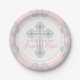 Elegant Silver Cross Pink Damask Baby Girl Baptism Paper Plate