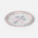 Elegant baptism paper plate design for baby girl in pale pink, silver grey, and white colour scheme. Includes a decorative cross and flourished damask border pattern and custom text that can be personalised "God Bless" with baby's name.
