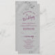 This beautiful wedding program features an elegant design with cassis purple or magenta text on a grey background and lacy silver grey faux foil curls and swirls in the corners. The titles are written in fancy script calligraphy, and there is space for your ceremony and wedding party details, as well as a short thank you for your guest. Wonderful way to welcome your friends and family to your wedding celebration.
