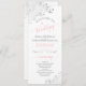 This beautiful wedding program features an elegant design with pink and grey text on a white background and lacy silver grey faux foil curls and swirls in the corners. The titles are written in fancy script calligraphy, and there is space for your ceremony and wedding party details, as well as a short thank you for your guests. Wonderful way to welcome your friends and family to your wedding celebration.