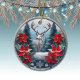 This round ceramic deer ornament features an elegant silver coloured frame that encircles a poinsettias festive design. The background showcases a serene Christmas scene, picturesque trees and winter snow landscape. A reindeer gracefully shows off his antlers, adding a touch of magic and Xmas holiday spirit to the ornament. Same Image is on the front and back. This ensures that no matter how the ornament turns, it always looks festive and complete. 🦌🎄