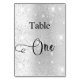 The table number is written with an elegant hand lettered style script. Black letters, a faux silver background with faux glitter dust, sparkles.