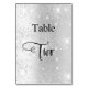 The table number is written with an elegant hand lettered style script. Black letters, a faux silver background with faux glitter dust, sparkles.