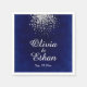 An elegant modern napkin design with a splash of silver glitter on a deep royal blue background with the names of the bride and groom in a beautiful hand written font. You can personalise it by going to the customise menu. This is part of a classy wedding suite with many matching pieces.