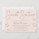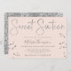 A chic, modern and elegant silver glitter script typography Sweet Sixteen birthday party invitation with glitter sparkle confetti on editable pastel blush pink and a glittery silver background at the back. A luxury and elegant sweet sixteen theme.