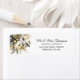 Wedding return address label depicts an elegant Christmas, winter floral watercolor with white flowers, gold berries and silver holly leaves and evergreens.