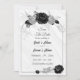Black and silver grey flowers with some leaves on a geometric frames on white and silver grey marble background save the date card.