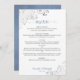 This beautiful wedding menu is simple, elegant, sophisticated and stylish. It features an elegant design with lacy dusty blue or periwinkle coloured script calligraphy and delicate silver grey curls and swirls in the corners on a classic white background. The back is a beautiful marbled blue colour.