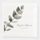 A simple yet elegant single stem silver sage green eucalyptus with a golden highlight and your names and numerical wedding date against the pure white background of the napkin