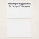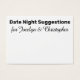 Here's a fun accessory to pick up for your engagement party or joint shower: date night suggestion cards on which guests can write personal notes to the bride and groom. On the front you read "Date Night Suggestions" in a bold, sans-serif font; this typeface is editable so you can choose another if you prefer... or even write a different message. Below there's a place for your names; these appear in a pretty script that is also easy to change. Change the background to any color you prefer!. Please do not hesitate to reach out to me if you have special requests or need other items. I am also happy to help with customization of these cards if you need. //