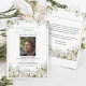 The invite features a portrait photo and place for custom text on the back. Green eucalyptus leaves symbolizes remembrance, peace, and strength.
