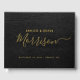 Simple chic gold calligraphy script bride and groom names wedding guest book with a modern luxury look on a black leather like background. +++++++++ Easy to personalise with couple's wedding details.