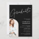 Elegant simple modern white on black photo graduation announcement invitation featuring cool modern brush script font, 2photos, and an arch overlay. Perfect grad celebration for senior high school open house party.