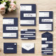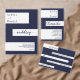 This elegant navy blue and white baby shower invitation is perfect for a modern wedding. the simple design features elegant blue calligraphy on white stripes on a navy blue background.