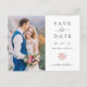 This elegant and simple save the date features a beautiful bouquet of watercolor pink roses and greenery with a photo of the bride and groom.