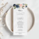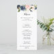 This elegant simple winter floral calligraphy dinner menu card is perfect for a modern wedding. The design features beautiful hand-painted dark blue, blue, navy, pink , blush, gold flowers and green foliage, bunched into elegant bouquets.