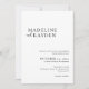 The wedding invitation features a minimalist and elegant design with a clean white background and black text. It uses a mix of bold serif and cursive fonts, with the couple's names prominently displayed in large text for emphasis. The details are centred and written in smaller serif font, creating a balanced and refined layout with ample white space for a modern, sophisticated aesthetic.