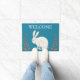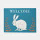 This outdoor welcome door mat has an elegant sitting white rabbit in between to tall leafy orange plants on a dark blue background. Customise the Welcome text with the template.