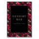 This is a gothic style image featuring an elegant black dessert bar sign framed by vibrant red roses and skulls, creating a striking contrast. The rich colours and intricate floral patterns evoke a sense of mystery and sophistication, perfect for adding a touch of edgy charm to any event or celebration. It invites guests with warmth and intrigue, making it ideal for themed parties or gatherings where you want to make a bold statement.
