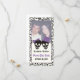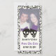 Elegant skulls Halloween purple wedding Save the Date photo card, featuring a black skull couple bride and groom on ivory background and a skull pattern border. The groom wears a purple hat and the bride a purple bow. Want help or a different colour scheme? Just click on Contact button under the product and ask for it!