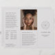 Elegant trifold brochure featuring a modern design with an abstract flower over a slate grey / grey background. If you prefer, you may replace the abstract flower image with your own logo in the template form. The template includes markers for the folds and you may remove them in the design editing tool. This trifold brochure is great for an aesthetician, hair stylist, makeup artist, beauty salon or nail salon.