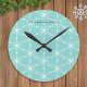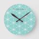 An elegant, modern wall clock with a festive geometric pattern of white snowflakes, on a fresh icy aqua blue background. Personalise with the recipient's name(s) as a stylish and useful holiday gift for the home.