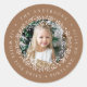Add a festive touch to your holiday envelopes with our Elegant Snowflake Wreath return address labels. The holiday return address stickers feature your photo encircled by a wreath of white snowflakes and pine branches with a gingerbread-coloured background. Your last name and return address are displayed on the outer edge of the round holiday stickers in white lettering.