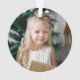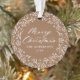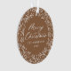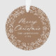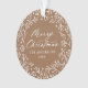 Elegant holiday photo ornament featuring "Merry Christmas" displayed in a white calligraphy script encircled by a wreath of snowflakes and pine branches on a gingerbread-coloured background. Personalise the front of the ornament by adding your family name and the year. The back of the ornament features your favourite family photo making it the perfect keepsake to give to friends and family.