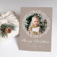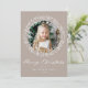Elegant holiday card with your photo encircled by a wreath of snowflakes and white pine branches on a festive taupe background. "Merry Christmas" is displayed in a bold white calligraphy script with your name and the year shown below. The back of the modern holiday card features a beautiful snowflake pattern.
