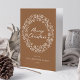 Elegant holiday card with "Merry Christmas" displayed on the front in a bold white calligraphy script encircled by a wreath of white snowflakes and pine branches on a toffee-brown background. Personalise the front of the non-photo holiday card by adding your name and the year. The inside of the card features space for your typed custom message or leave blank to write your own. The back of the modern holiday card features a beautiful snowflake pattern.