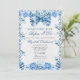 This elegant design features a watercolor Victorian floral motif showcasing delicate blue and white chinoiserie-style elements, including a vintage bow. Stylish calligraphy is paired with classic serif fonts.