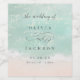 Romantic coastal themed wedding wine label feature beautiful turquoise abstract watercolor sparkling ocean wave and beach background, toped with stylish script and elegant font event details, modern and simple, great for sand beach wedding, tropical destination wedding, coastal ocean themed wedding.