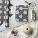 Christmas gift wrap adorned with silver glitter stars and baubles (simulated in art work no glitter used)