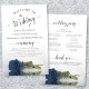 These wedding programs are elegant and tasteful, while still being budget friendly. The design features a single long stemmed dusty steel blue grey coloured rose lying on its side, reflecting in a pool of water with waves and ripples. The typography features lacy black script calligraphy, and there is room for details on the ceremony, the bridal party, and a short thank you.