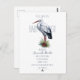 An elegant unique stork illustration baby shower postcard invitation with soft blue grey script and handwritten style typography; for a simple elegant gender neutral baby shower invitation template to customise. When you personalise the template you may scroll down and click on "customise further" to choose from our large font selection, or to re-size the type or changer colours.