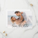 Modern Elegant Stylish Script Photo Wedding Save The Date Cards. Features one full photo and a fashionable photo overlay calligraphy hand-lettered swash tail font script in classic black and white capture the essence of contemporary elegance. Easily customise each card by incorporating cherished wedding details and a picture, offering a refined and sophisticated means to announce and celebrate your extraordinary day.
