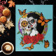 This richly detailed illustration features a captivating sugar skull woman posed alongside a second ornate sugar skull, creating a layered and symbolic composition inspired by Día de los Muertos traditions. The woman’s intricately painted face is adorned with vibrant floral patterns and delicate web detailing, while the companion skull echoes those bold decorative motifs with colourful blossoms and heart accents.