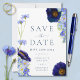 Beautiful elegant hand painted watercolor summer florals including meadow wildflowers in blush blue, dusty blue, navy blue, cornflower blue, purple, green and yellow hues wedding save the date card. Flowers including cosmos, cornflowers, poppies and forget me nots with foliage. Easy to use template with modern romantic typography script. Perfect for a unique floral botanical navy blue themed summer or spring wedding. Unique original artwork by artist Catherine Sweetman