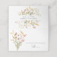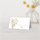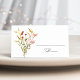Elegant floral wedding place card featuring a bouquet of watercolor wildflowers and foliage in shades of pink, yellow, red, and green with a white background. The boho wildflower place cards reverse to display your names and wedding date in black lettering inside of a rectangle frame of wildflowers. The beautiful wildflower wedding place cards are perfect for spring and summer weddings.