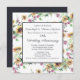 Fall watercolor sunflowers and pink florals on white background with wedding anniversary templates in a square box bordered in midnight blue. Midnight blue on back.