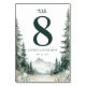 This is a minimalist style image featuring an elegant table number card for a wedding. The large, bold "8" in dark green stands out against the soft white background, surrounded by beautifully illustrated pine trees and wildflowers at the bottom. A serene mountain landscape adds depth to the composition, creating a peaceful and natural ambiance. Perfect for setting a sophisticated yet inviting tone at your special event, this design captures both elegance and tranquillity.