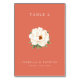 This is a minimalist style image featuring an elegant table number card for "Table 2" set against a warm coral background. At the center, there's a beautifully illustrated white peony flower with green leaves, adding a touch of natural charm and sophistication. The names "Isabella & Patrick" are elegantly written below the flower, along with their special date, Saturday, June 6, 2026. It exudes a sense of refined elegance and joyous celebration, perfect for wedding or event decor to guide guests with grace.
