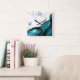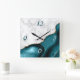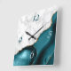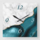 Elegant modern white marble and teal agate trimmed with faux gold glitter combine in this luxurious square wall clock. The numbers 3 and 6 appear in light gray on the teal agate background, while the numbers 9 and 12 appear in dark teal on the white marble.