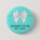Elegant Teal Aqua Tiffany Mother To Be Baby Shower Button. Pamper the mother to be with a tiffany theme baby shower! Just personalise the text to create a chic, modern, retro baby shower for the mummy to be who has everything. The combination of teal aqua blue turquoise with pearls and a white bow coordinate with our Tiffany Theme Baby Shower invitations, party decor, tableware and more!