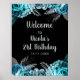 Pretty birthday welcome sign with teal blue flowers and silver foliage. The words can be changed to suit your own details or requirements. Would be perfect for a birthday party.