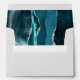 The inside of this elegant modern wedding invitation envelope features a teal blue watercolor agate design trimmed with faux silver glitter. Customise the back flap with the names of the bride and groom in teal handwriting script and the return address in charcoal grey copperplate font on a pale grey background.