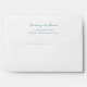 This wedding envelope features a minimalist design with centred text on a clean white background, creating an elegant and sophisticated look. The names are written in a graceful cursive script, while the address is presented in a simple sans-serif font for clarity. A soft teal colour palette adds a touch of calmness and refinement to the overall aesthetic. Perfect for weddings, this envelope combines simplicity with functionality, ensuring your special day is celebrated with style.