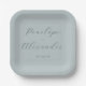 This elegant wedding plate features a minimalist design with a muted teal background and soft grayish-black text. The layout is clean and balanced, showcasing the names "Penelope" and "Alexander" in a sophisticated script font, followed by a date in a simple sans-serif style. The absence of additional motifs keeps the focus on the typography, creating a timeless and contemporary look perfect for formal occasions. Ideal for weddings, this plate combines simplicity with grace, making it a stylish addition to any celebration.