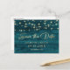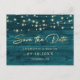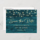 Custom teal rustic wood wedding save the date postcards with faux gold foil script font and featuring a rustic wood background adorned with string lights. Easily personalise this rustic save the date postcard with your wedding details. For custom requests, please send us a message.