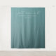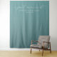 This elegant wedding backdrop features a minimalist design with a soft, muted teal gradient background that transitions from darker at the top to lighter at the bottom. Centred on the backdrop is the phrase "just married" in an elegant cursive script, followed by customisable names and date presented in clean, modern sans-serif typography. The ample negative space around the text enhances its simplicity and sophistication, making it perfect for celebrating your special day. The contemporary yet timeless style evokes a sense of joy and refinement, ideal for creating memorable wedding photos.